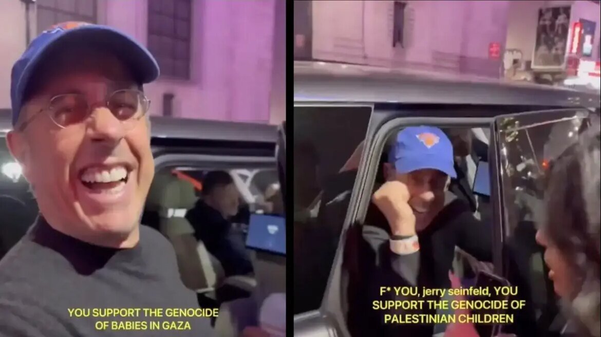 ג'רי סיינפלד הפך לוויראלי שוב בעקבות תגובתו למפגינה פרו-פלסטינית שצעקה לעברו ברחוב. בסרטון שפורסם בטוויטר נראה הקומיקאי היהודי, תומך ישראל מוצהר, כשהוא בדרכו לרכבו, בזמן שאישה מחוץ לפריים קוראת לעברו "שחררו את פלסטין".