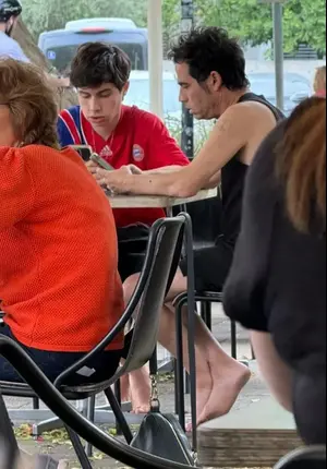 שכניו של גפן, שכבר רגילים לראות אותו ברחובות השכונה כשהוא צועד יחף, הופתעו לראות כי הוא הוריש את המנהג גם לבנו. וכך ישבו להם היום האב ובנו כשהם יחפים בבית הקפה, תוך שהם מביעים עניין רב בטלפונים הסולאריים שלהם. אולי עוקבים אחר ההתפתחויות בנוגע לשחרורו של החייל החטוף עידן אלכסנדר?