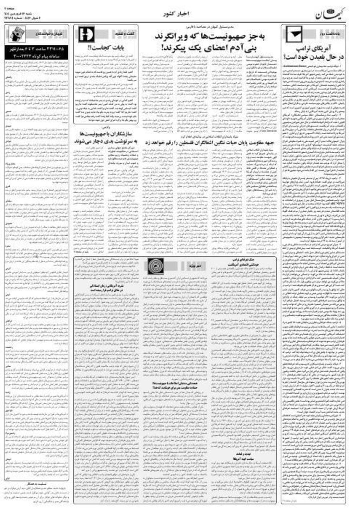 העיתון האיראני "קיהאן", המקורב למנהיג העליון של איראן, פרסם אתמול איום מפורש על חייו של נשיא ארה"ב דונלד טראמפ. "בימים אלה, כנקמה על חיסולו של סולימאני, יירו בטראמפ, "נכתב בעיתון בעריכת חוסיין שריעתמדארי, שמונה ישירות על ידי עלי חמינאי. האיום מגיע על רקע הבטחות חוזרות ונשנות של בכירי המשטר האיראני ל"נקמה קשה" בעקבות חיסולו של מפקד כוח קודס, קאסם סולימאני, בשנת 2020.