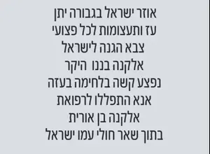 אלקנה לוי, בנה הנוסף, נפצע אמש (שני) בעזה. בפוסט בפייסבוק ביקשה אורית להתפלל עבור רפואתו.