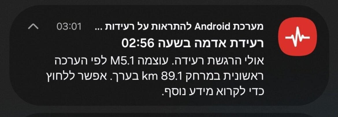 רבים מתושבי ישראל קיבלו הלילה (שישי) רגעים מבהילים במיוחד: לא רק אזעקות צבע אדום בשל ירי רקטות נשמעו בסביבות השעה 03:00 לפנות בוקר, אלא במכשירי אנדרואיד הופיעה גם התראה פתאומית על רעידת אדמה. ההתרעה, שהופיעה במסכים באופן בולט ודרמטי, כללה את הכיתוב "Earthquake detected!" והובילה רבים לחשש כפול. אלא שלפי בדיקה רשמית, מדובר בהתראת שווא – והסיבה לכך מפתיעה במיוחד.