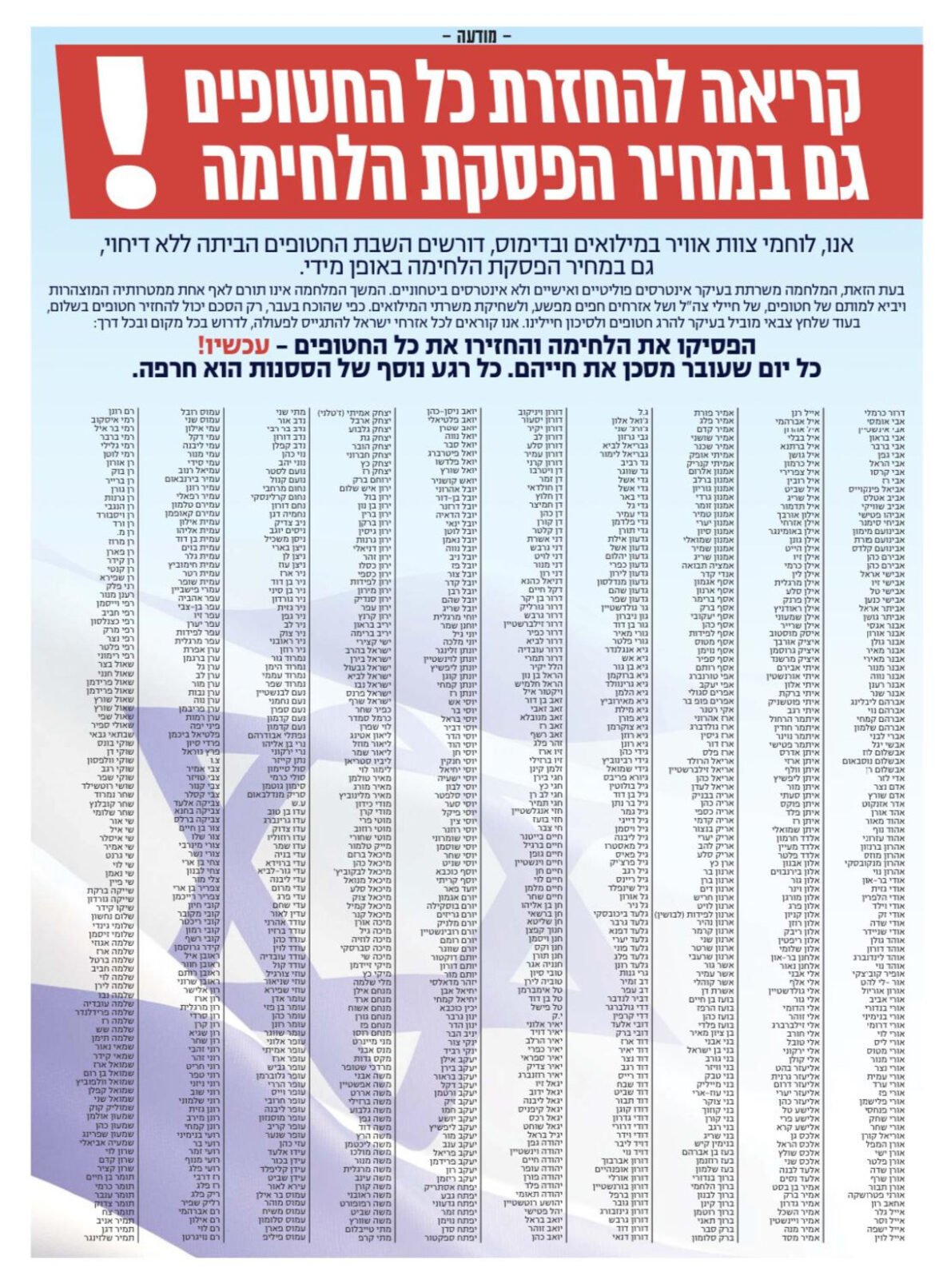 אחד הקצינים שחתם על אחת העצומות שהביעה תמיכה במהלך הטייסים והקריאה לפעול לשחרור 59 החטופים גם במחיר של הפסקת המלחמה, סיפר ל"מעריב" על השיחה שקיבל ממפקדו הבכיר: "הוא ניסה להסביר לי שהאפקט התודעתי הושג, וביקש ממני להסיר את החתימה מהעצומה. אמרתי לו שאני צריך לחשוב על זה. אז הוא ביקש להיפגש איתי לשיחה בנסיון לשכנע אותי להסיר את החתימה".