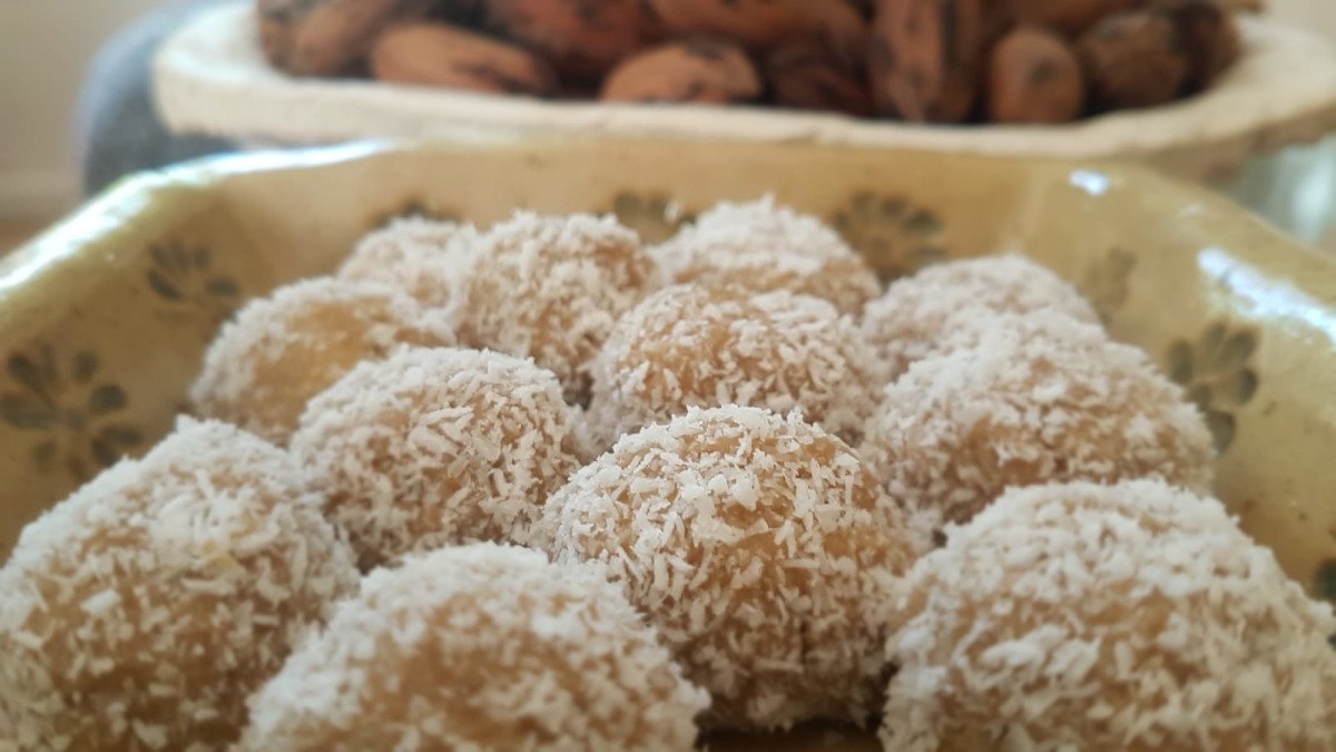 מערבבים את כל הרכיבים בקערה, יוצרים כדורים קטנים, מגלגלים בקוקוס ושומרים במקפיא.