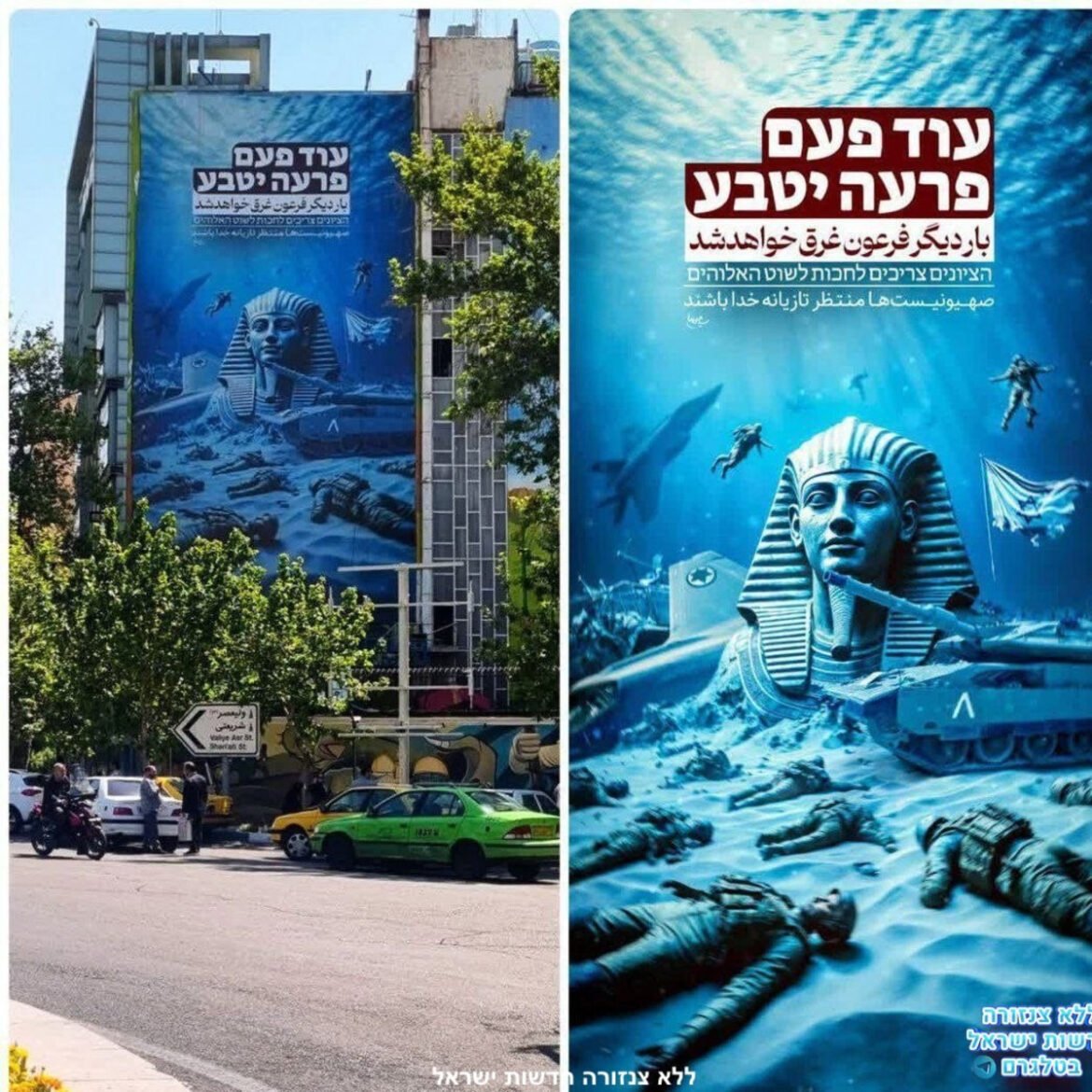 פעם נוספת, משטר האייתולות באיראן החליף את הפוסטר העצום ב"כיכר פלסטין" שבטהראן, וניסו לשלב איום על מדינת ישראל עם הקשר לחג הפסח שצוין בישראל בשבוע שעבר: "עוד פעם פרעה יטבע; הציונים צריכים לחכות לשוט האלוהים".