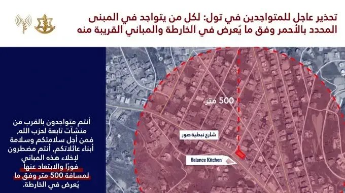 בהודעה מצויין: "במיוחד כל הנוכחים בבניין המסומן באדום, כפי שמוצג במפה, ובבניינים הסמוכים לו – אתה נמצא ליד מתקנים השייכים לחיזבאללה הטרוריסטית. למען בטיחותכם ובטיחות משפחותיכם, עליכם לפנות את הבניינים הללו באופן מיידי ולהתרחק מהם למרחק של לפחות 500 מטרים, כפי שמוצג במפה".