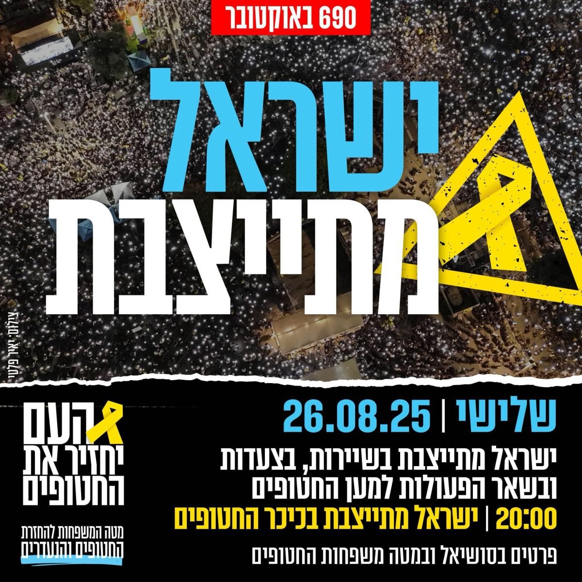 מטה משפחות החטופים הכריזו על יום הזדהות אזרחי המוני שיתקיים ביום שלישי הקרוב (26 באוגוסט) תחת הכותרת “ישראל מתייצבת”. הקריאה מגיעה בעקבות יום העצירה שהתקיים ביום ראשון האחרון. במסר שפרסם מטה המשפחות להחזרת החטופים נכתב כי הם רואים בפעולה זו “צו השעה המוגש לכל ישראלי”. המשפחות טוענות כי ראש הממשלה בנימין נתניהו מבצע “טרפוד יזום נוסף” של הסכם לשחרור החטופים.