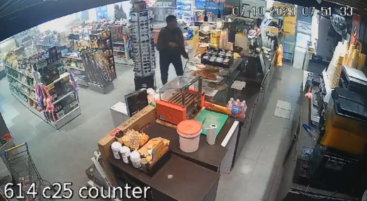 תיעוד מחבלי חמאס מסתערים על תחנת דלק, בוזזים את החנות ומתחבאים במקרר. צילום: מצלמות אבטחה