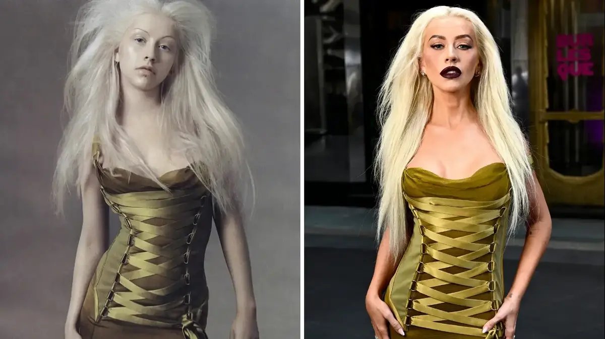 היום, כשהיא שומרת על שגרה מאוזנת וגם הוודג' פגש את הדוקטור לכמה וכמה מזרקים (אי אפשר לפספס את זה), היא עושה קאמבק לאחד הלוקים הכי זכורים שלה מלפני 22 שנה. מדובר בפיס ארכיוני לבית ורסצ'ה, שמלת מחוך, שהציגה שוב השבוע בבכורת המחזמר "בורלסק" בתיאטרון סבוי בווסט אנד בלונדון. השמלה שהוכיחה את עצמה כפופולרית בקרב כוכבות בשנים האחרונות (ביונסה, דבון לי קרלסון) – עשויה מבד ירוק זית דמוי קרפ מקומט, שגלשה על גופה של אגילרה בקלילות. השרוולים נשפכו על זרועותיה העליונות, בעוד שהחצאית כללה שכבות קפלים שעיטרו את המכפלת הא-סימטרית ואת הצדדים. שני פאנלים מבד ירוק בהיר יותר עיצבו את מחוך החלק העליון, מחקים מראה של מחוך, עם סרטים בגוון ירוק-צהבהב השרוכים בהצלבה בפרונט.