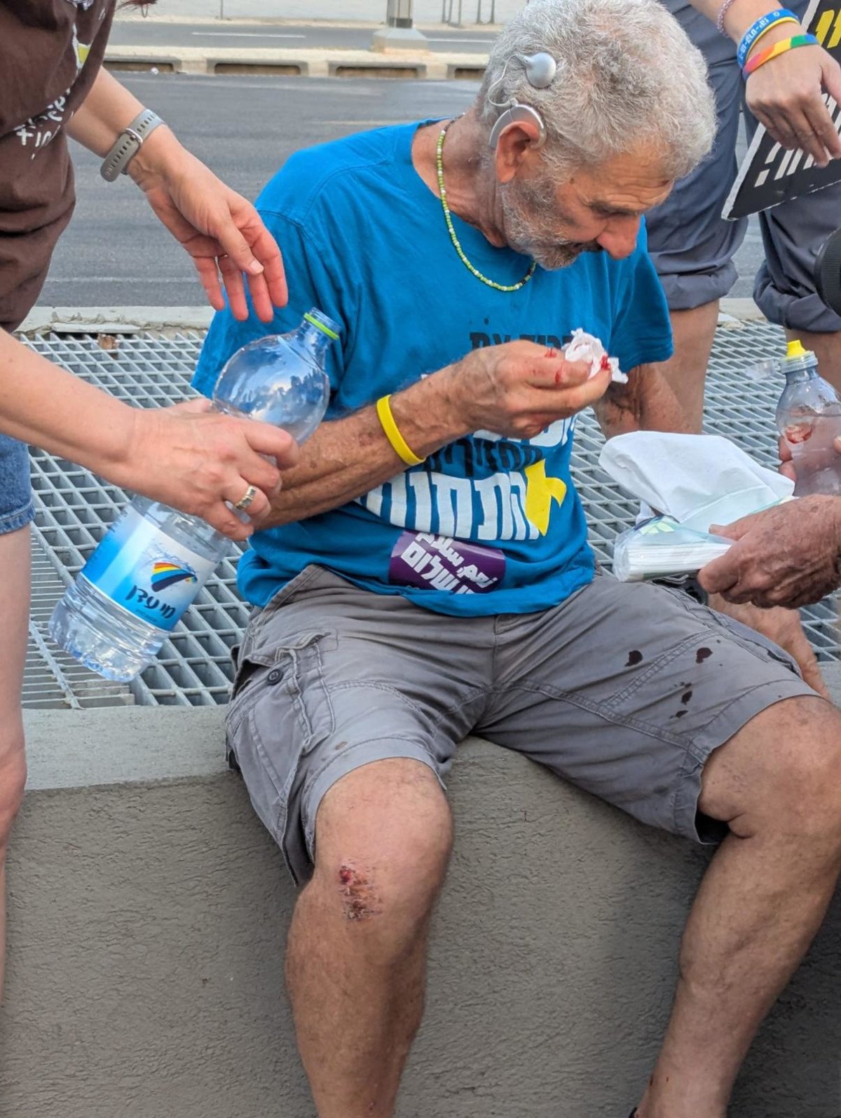 מפגין בשנות ה-70 לחייו הותקף היום (שני) אחר הצהריים במהלך ההפגנה היומית בדרך בגין בכניסה לקריה, זאת על ידי אופנוען שניסה לפרוץ את החסימה בזמן הקראת שמות החטופים.