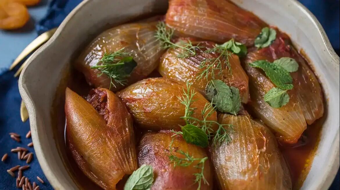 5. ממלאים את גלדי הבצל: מפרקים את הבצלים בזהירות לגלדים וממלאים כל גלד בכפית גדושה מהמלית. סוגרים את הגלד סביב המלית ומניחים בצלחת.