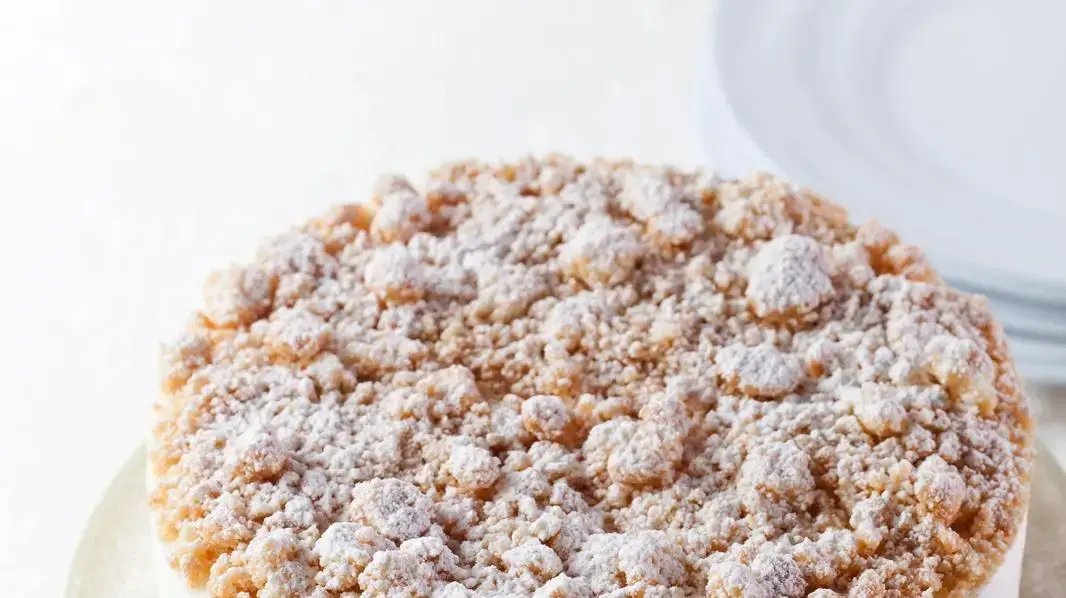5. מרכיבים את העוגה: יוצקים את המלית לתבנית האפייה מעל הבצק הפריך האפוי, ומפזרים את הפירורים מעל. מכניסים למקרר למשך 24 שעות. בוזקים אבקת סוכר ומגישים.
