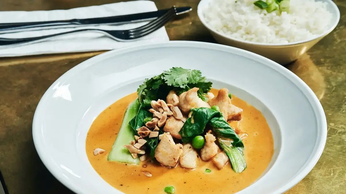 4. יוצקים מעל את תבשיל הקארי המסונן, מפזרים מעל בנדיבות כוסברה ובוטנים קצוצים, ומגישים, רצוי מעל אורז.