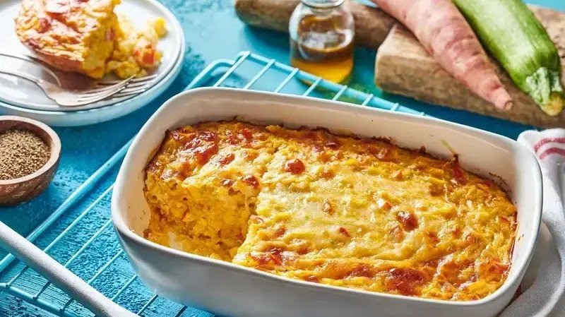 5. מניחים חצי מהירקות בבסיס התבנית ויוצקים מעל מחצית מהבלילה. מניחים מעל את שאר הירקות, יוצקים מעל את הבלילה שנותרה, מערבבים מעט בעזרת כף ומפזרים מעל גבינה.