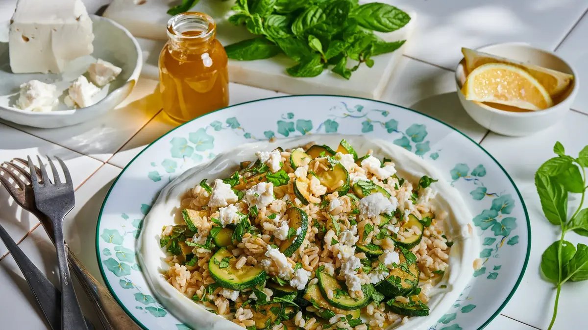 4. ממש לפני ההגשה מערבבים את הגריסים המסוננים (חשוב שיהיו קרים) ביחד עם הזוקיני, בצל סגול, עלי נענע, 2 כפות מיץ לימון, 2 כפות שמן זית, מלח ופלפל.