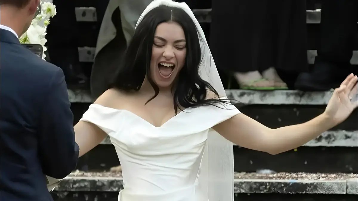 כשהיא אוחזת בזר פרחים לבנים, הציגה שמלמלת מיני לבנה, בעלת מחשוף מתוק, עשויה מבד קרפ סאטן בגימור מנצנץ (כ-15,200 שקלים). שלא כמו כל כלה מפורסמת אחרת, בחרה בעיצוב מסחרי שנמכר באתרי קמעונאות האופנה המקוונים – ולא בהתאמה אישית ומחשבה מקדימה, מה שמעיד גם על אפקט ההפתעה של האירוע כ"על הדרך". גזרת אוף-שולדרס שמדגישה את עצמות הבריח ומוסיפה אלמנט רומנטי ומפתה, בעלת קפלים עדינים באזור החזה והמותניים היוצרים מבנה נשי ומחמיא, ומדגישים את קימורי הגוף בצורה מחושבת ואלגנטית. כל זאת, בסגירה של חצאית א-סימטרית המתקצרת מקדימה ומתארכת קלות מאחור.
