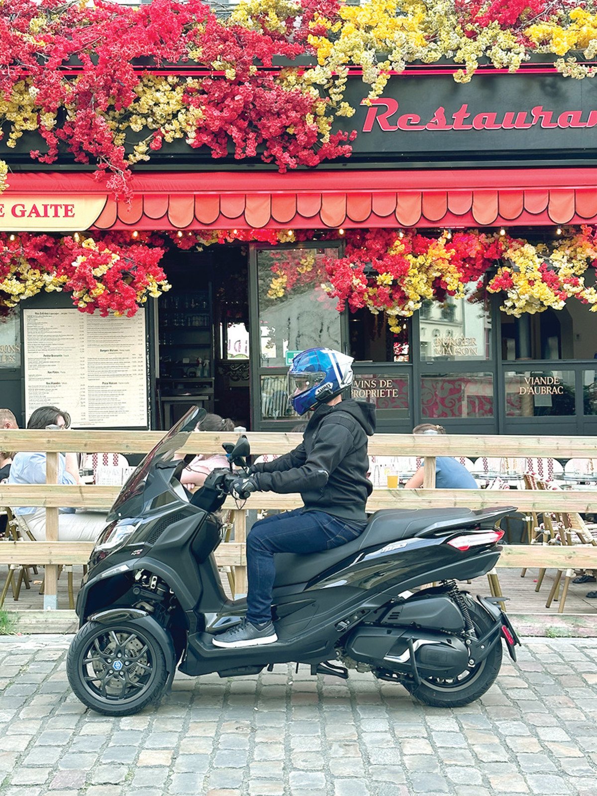 מנסה להרוויח קצת שפיות בגיחה הקצרה הזאת החוצה מעולם החדשות המוטרף שאנחנו חיים בו, כשמסביב סתם אנשים שסתם אוכלים להם לא־סתם־קרואסון פריזאי של ראשון בוקר. אין להם מושג על מלחמה, על חטופים, אין להם ילדים בעזה. כן, יש להם צרות משלהם, בין השאר איך הם מעדיפים את הקטנוע שלהם, עם שני גלגלים או שלושה.
