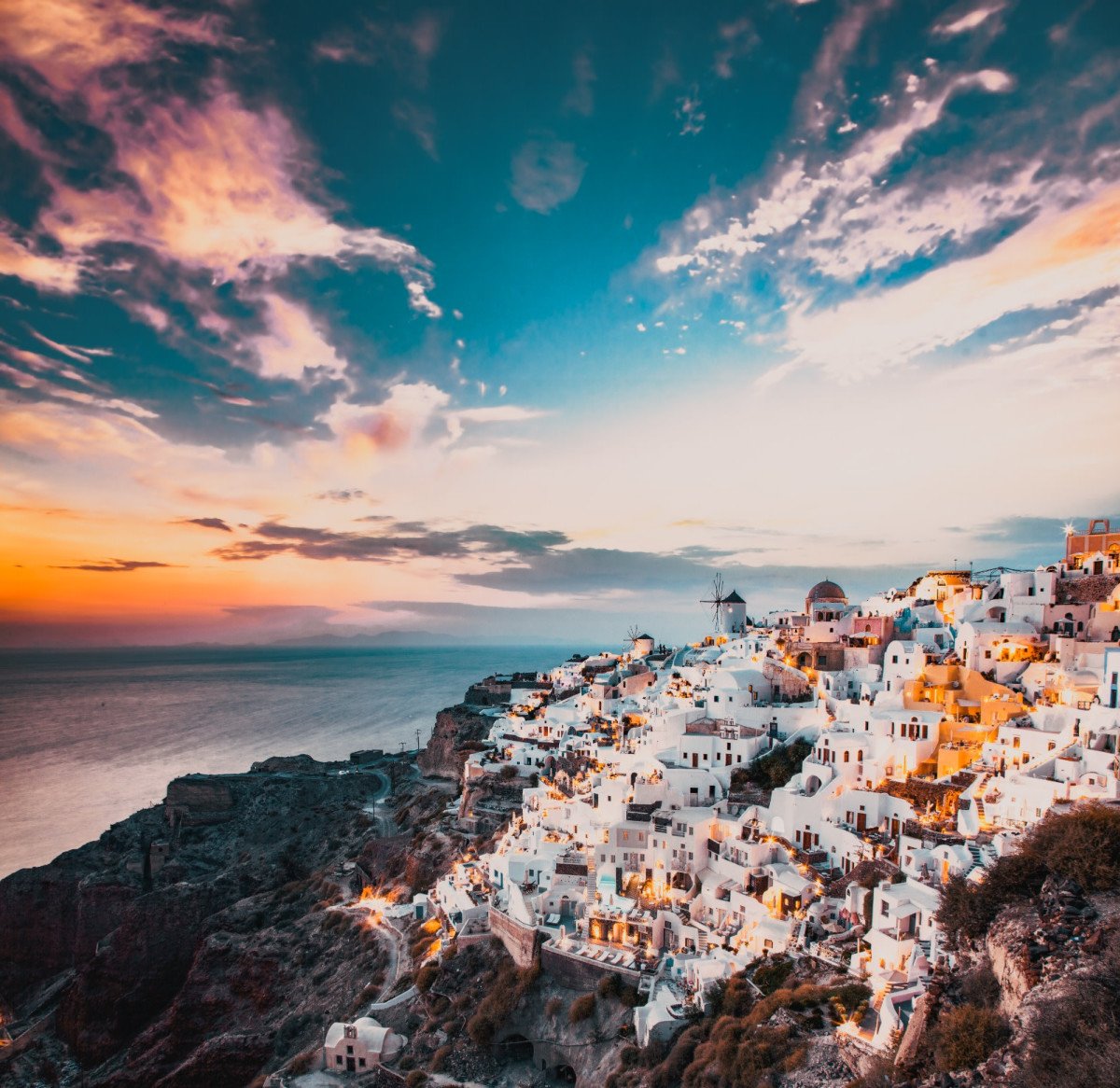 המוני תיירים עומדים לראות את השקיעה בסנטוריני (צילום: REUTERS)